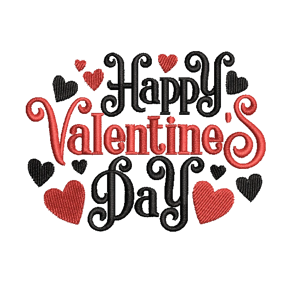 Happy Valentines Day With Hearts Embroidery Design showcases bold lettering in red and black with scattered heart accents, creating a romantic and festive look ideal for Valentine gifts, apparel, accessories, and decorative embroidery projects.